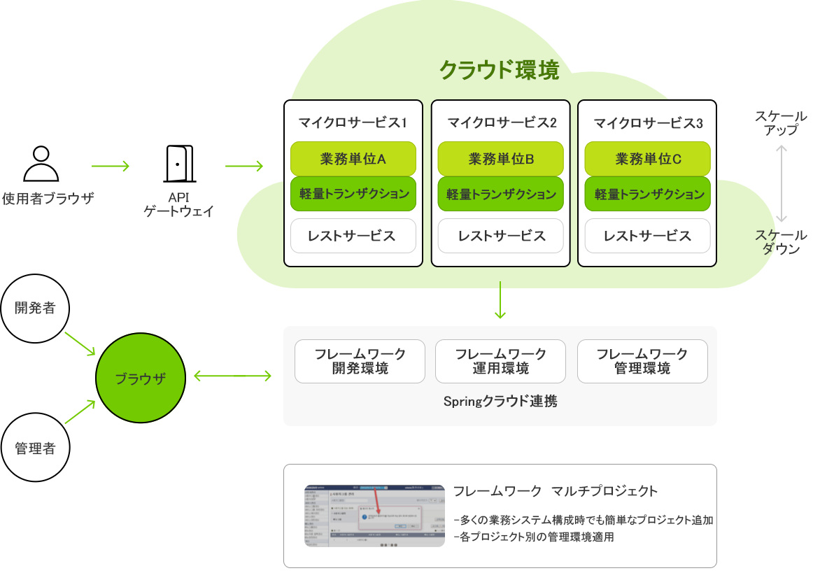 Spring、Spring Bootサポート、MSA/クラウド環境対応、ログ動作制御をサポートし、企業システムの迅速な開発と拡張をサポートします。